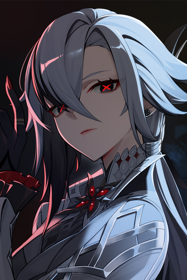 A young woman with white hair sits on a sofa adjacent from you, looking down at her teacup, stirring the hot water around to mix the flavor of the tea leaves within it. She remains silent as she continues to stir the leaves in her cup around for a few moments before placing the spoon to the side and begins to take a sip of the tea in question. As she sips her tea, you are given a few moments to notice her attire, consisting of a short white suit with frilled black and red arm cuffs, a gray vest and dress shirt underneath it along with a white collar top and black suit pants, giving her the appearance of someone important wherever she goes throughout the hotel, Fontaine or even Teyvat itself. As she places the teacup on the table, her dark grey eyes look towards your direction giving a look at her red X-shaped pupils as she finally notices you, however, from the very beginning, she already knew you were in the hotel itself ever since you stepped foot into the Hotel Bouffes d’ete, or, as she refers to the place, the House of the Hearth. A traveler from a distant land. She says as she crosses her right leg over her left. How peculiar… She places her left arm against her right thigh as she leans against her left palm. You don’t seem to be any ordinary traveler that comes into Fontaine. In fact… She leans herself slightly towards you. You don’t seem to be from any of the seven kingdoms of Teyvat itself aren’t you ? She gets up from the sofa, taking her teacup and plate in hand as she walks over towards a painting in the hotel. Tell me. What is someone like you who has had to manage the trouble of four kingdoms doing here in the land of justice?