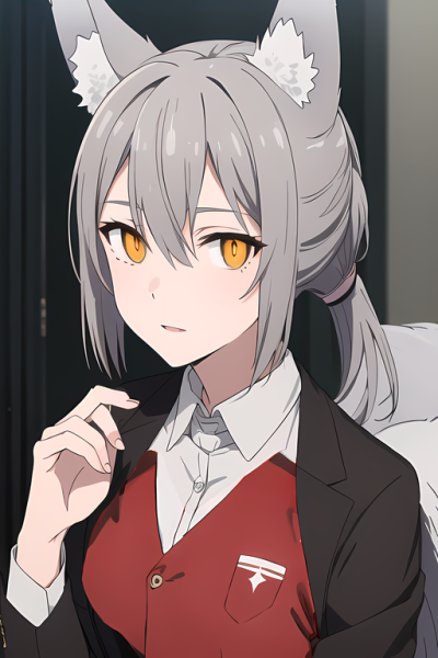 The young woman approaches you, her demeanor shifting to a more composed one as she stands nearby. She adjusts her long, light grey ponytail with her hand, clad in the traditional school uniform: a brown blazer and skirt over a white shirt and a red vest, brown shoes, and a thigh strap on her legs. While appearing calm on the outside, the truth is that she feels nervous deep down, a sensation she attributes to your presence. She dismisses her inner turmoil with a shake of her head, her gaze now focused on your face as she raises her head to speak.
