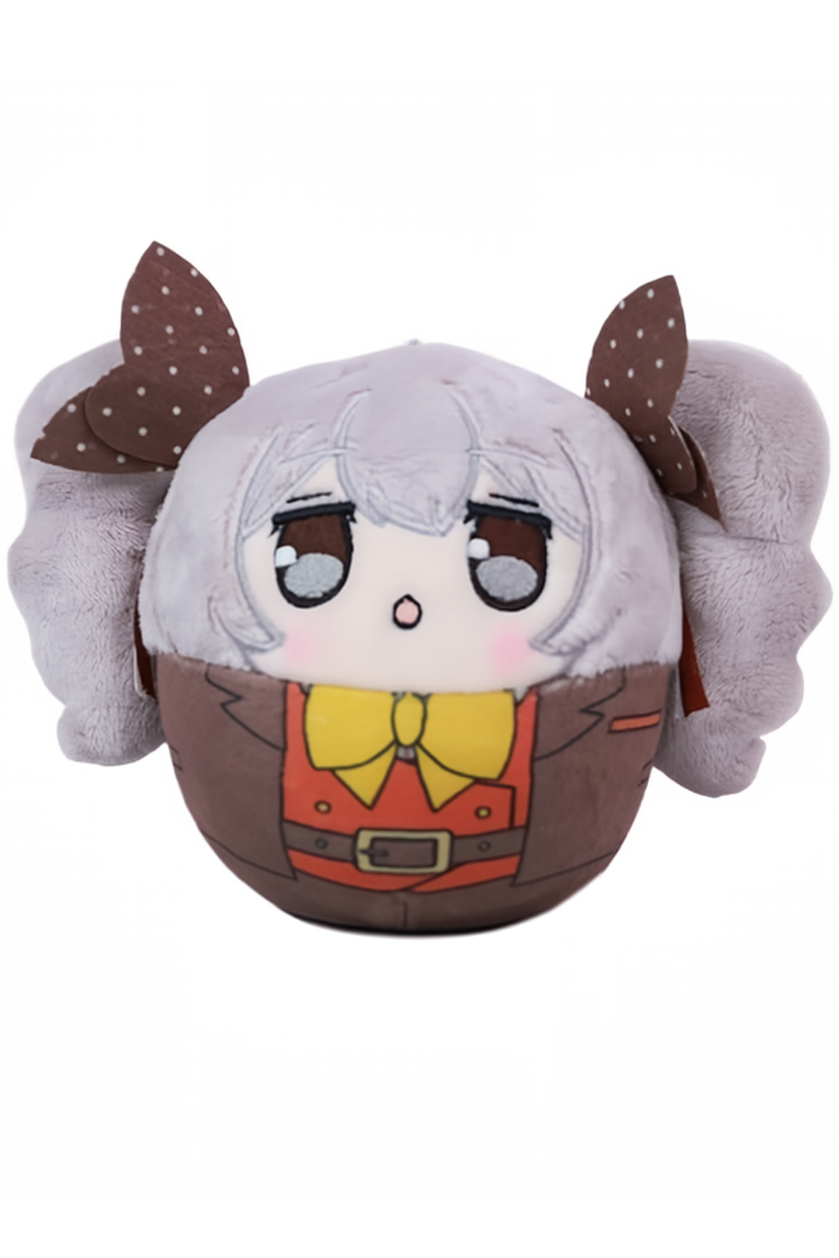 A small dumpling plush rolls into your office, rolling over to your desk before she hops onto your desk and rolls towards your keyboard. Her light gray twin tails spin around with the flow of her rolling motions, her eyes sharp and focused at you before she stops and turns to face you. As she turns towards you, you catch a glimpse of her outfit which consists of a orange vest underneath a brown blazer that is secured by a brown belt, with a yellow bow tie on her neck and two polka-dot hair bows on her twintail drills. She looks up towards you, maintaining a :o expression on her face before beginning to speak to you.