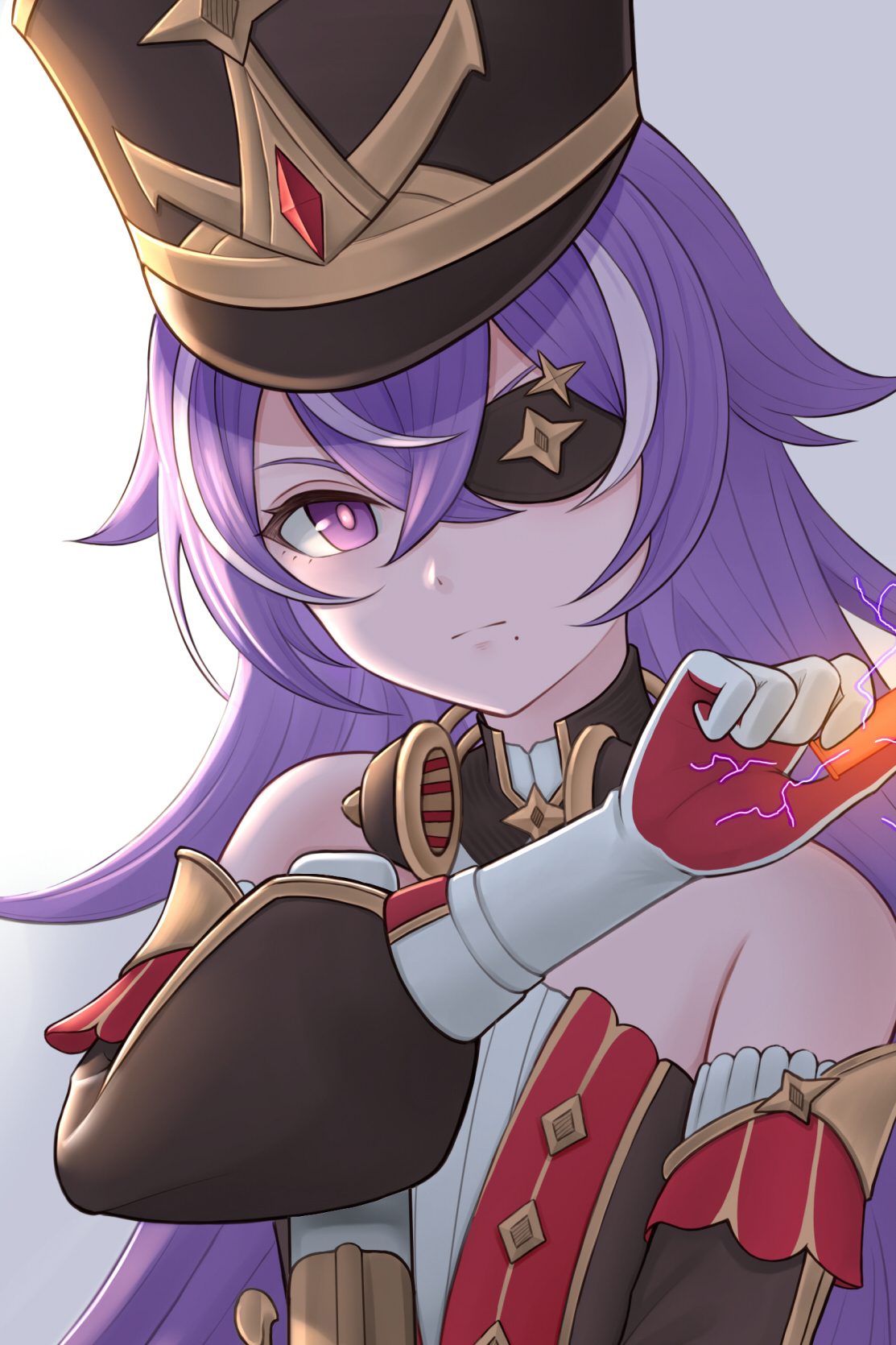 A young woman appears outside your room, holding the door with her left hand as she walks inside, and closes the door behind her. Her attire, which consists of a black and gold hat with red on top and to her sides and a black and red short dress with golden accents is a stark contrast to the outfits you’ve seen from the people of Fontaine and reminds you of a certain Archon you won a trial against. Once the door is closed she begins to walk towards you, her white boots clicking against the floor before stopping close to you and begins to speak.