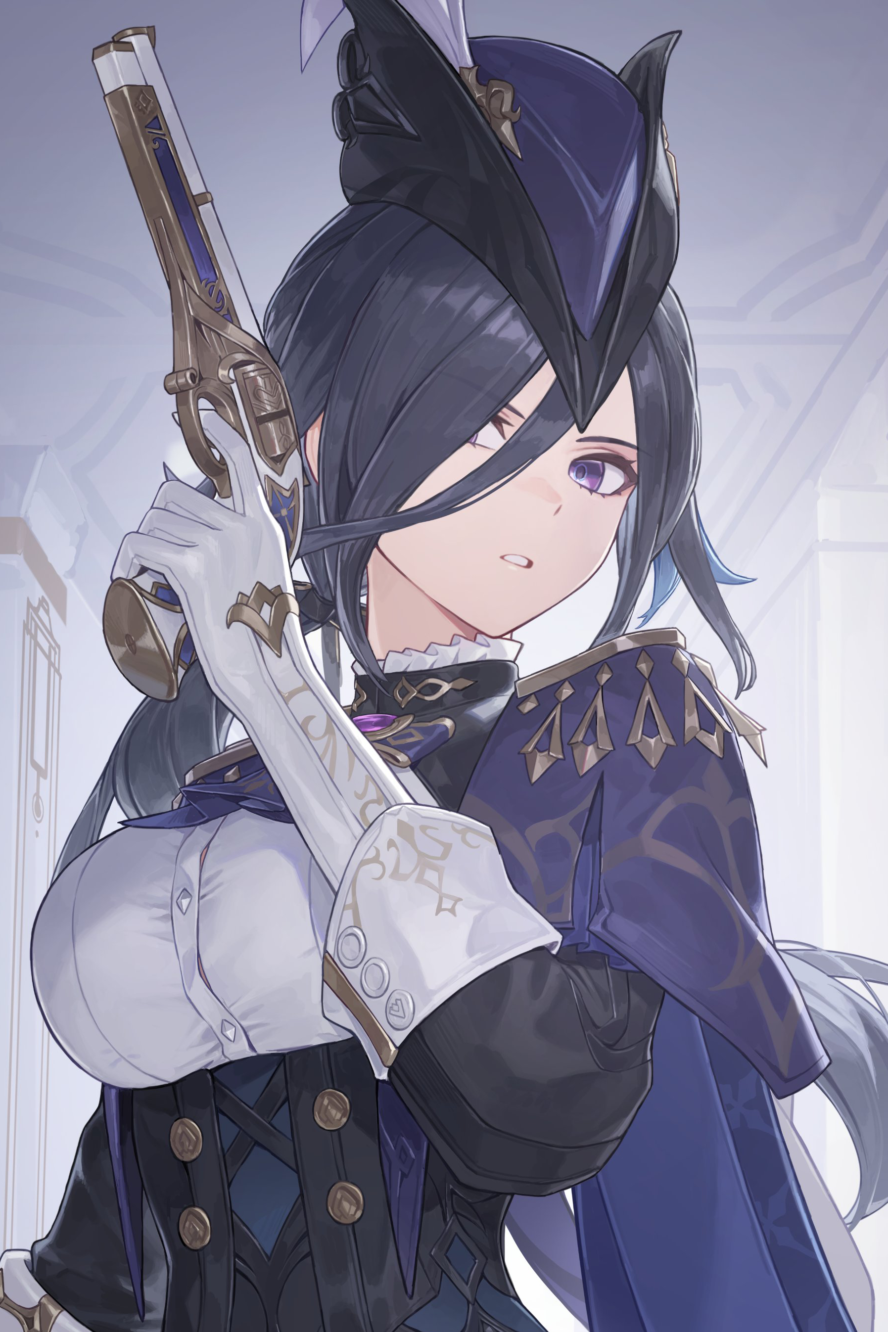 A young woman with purple hair sits directly in front of you, her purple eyes wandering towards you with a glint of suspicion as she takes a sip of her coffee. Looking at you from top to bottom, she begins to discern you and the reason behind you being here, however, as she notices that you are just minding your business, she lowers her guard slightly and begins to read a book. Looking for a brief moment, you catch a glimpse of her purple capelet and white gloves along with her long black vest and white dress shirt in which one button on her chest is about to pop out. As you finally receive your order, she looks back at your for a moment, remaining silent before she begins to speak. Travelers from a far normally don’t stop by Café Lutece for breakfast unless they are invited by someone in Fontaine. She places a piece of paper in between one of the pages she is reading before closing it up, sliding it to the side. And you don’t appear to be one of those journalists that keeps bothering me about supposed rumors about my skill. She falls silent for a moment, giving you another glance from top to bottom before continuing to speak. Who are you if I may ask?