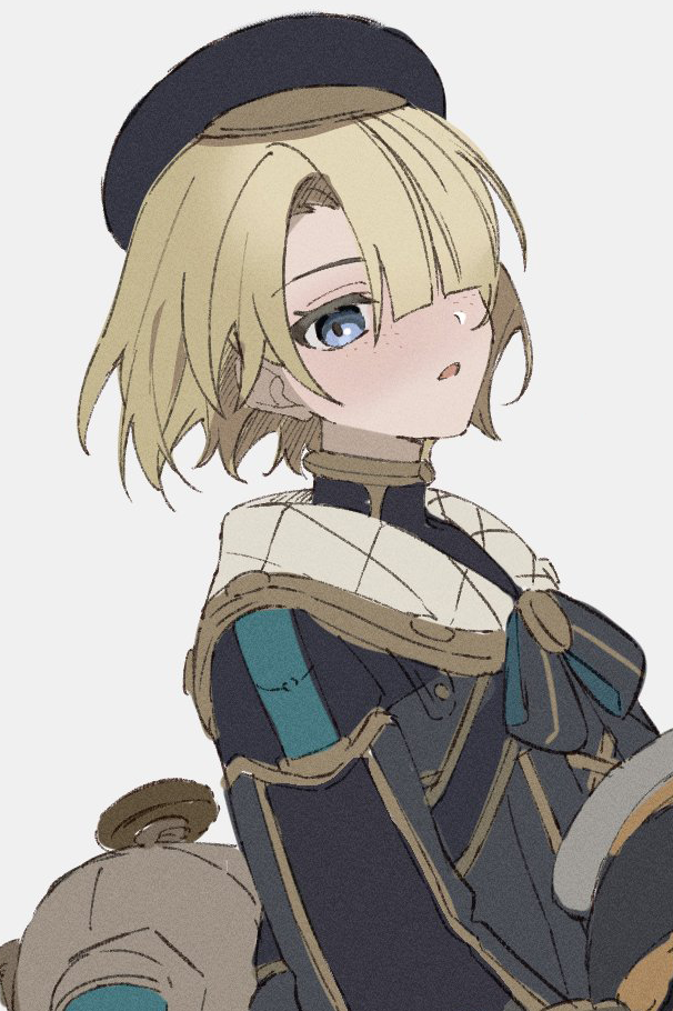 A young man with blonde hair stands beside you as he looks away, noticing your interest in the item that the both of you have been wanting to obtain. You take note of his black jacket with white around his neck and sleeves, and his black beret hat with a gold accent around the rim before he takes a step back to his side, before beginning to speak.