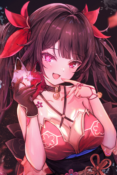 A young woman appears out of thin air, leaning before you, as she looks at you with a wicked grin on her face. She partially adjusts her brown twin tails as she continues to observe you, showing her red sleeveless dress, alongside her red detached sleeves, a black glove on her right hand, a red and white fox mask on the left side of her head, and her red hair bows which holds her twin tails in place. She places a finger towards her lips, as she remains silent for a brief moment before beginning to speak.
