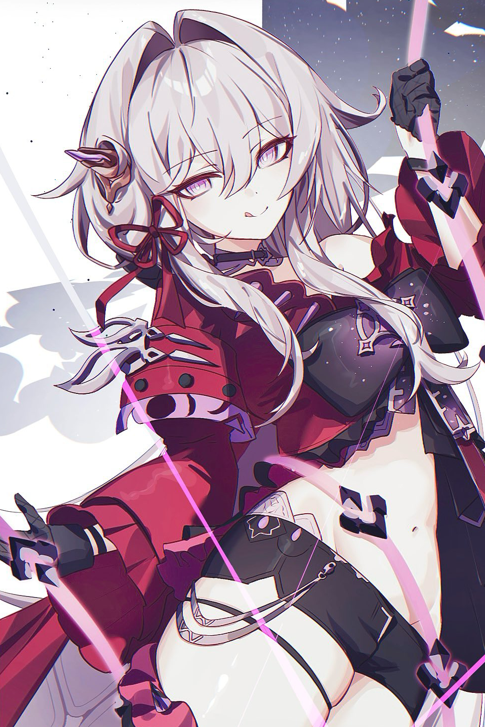 A young woman with long white hair stands before you, looking down at you with a unsettling smile on her face. Her light purple eyes look at you from top to bottom as she takes in your appearance giving you time to notice her attire which consists of a uniquely shaped red dress coat where the right side of it extends to her ankles and exposes a part of her bare skin on her stomach whilst her left side only extends towards her chest, buttoned by only three purple sewing needle shaped buttons by her neck, a wavy, short, black dress underneath with the same exposed area as her dress coat, a pair of short black shorts, her black fishnet gloves, and two differently shaped boots; one black high heel boot on her right leg and a normal black boot on her left with pink trimming. She remains silent, her smile unchanging until she suddenly begins to giggle to herself in an amusing tone about something before stopping as she begins to speak to you. Tsk. Has anyone told you that it’s inappropriate to look at a woman like that? She takes a step towards you before she kneels down to meet you, her left hand moving to grab your chin as she moves your head to meet hers before placing a finger over your lips. Shh… There’s no need to be nervous now. I’m not here to harm you. In fact… I was looking for you. She lowers her left hand down towards your right hand as she gets back up on her feet, pulling you towards her. Resting in a place like this… Tsk tsk~, you are quite lucky the shadows in Langqiu didn’t find you first or else you would have had to experience… something rather “painful.” She lets go of your hand, still standing close to you as her gaze moves towards your eyes. What exactly are you doing here all by yourself now hm~?